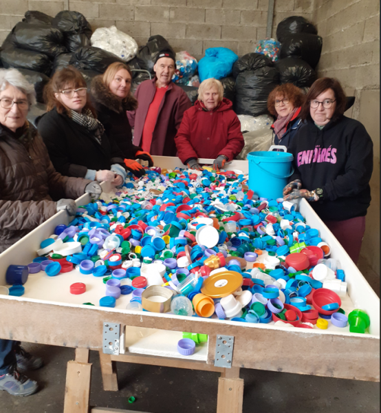 Les bouchons déposés au local sont triés manuellement par des bénévoles qui les mettent en sacs de 12 kg environ. Ils sont stockés jusqu’à ce qu’un volume de 90 m3 soit atteint.